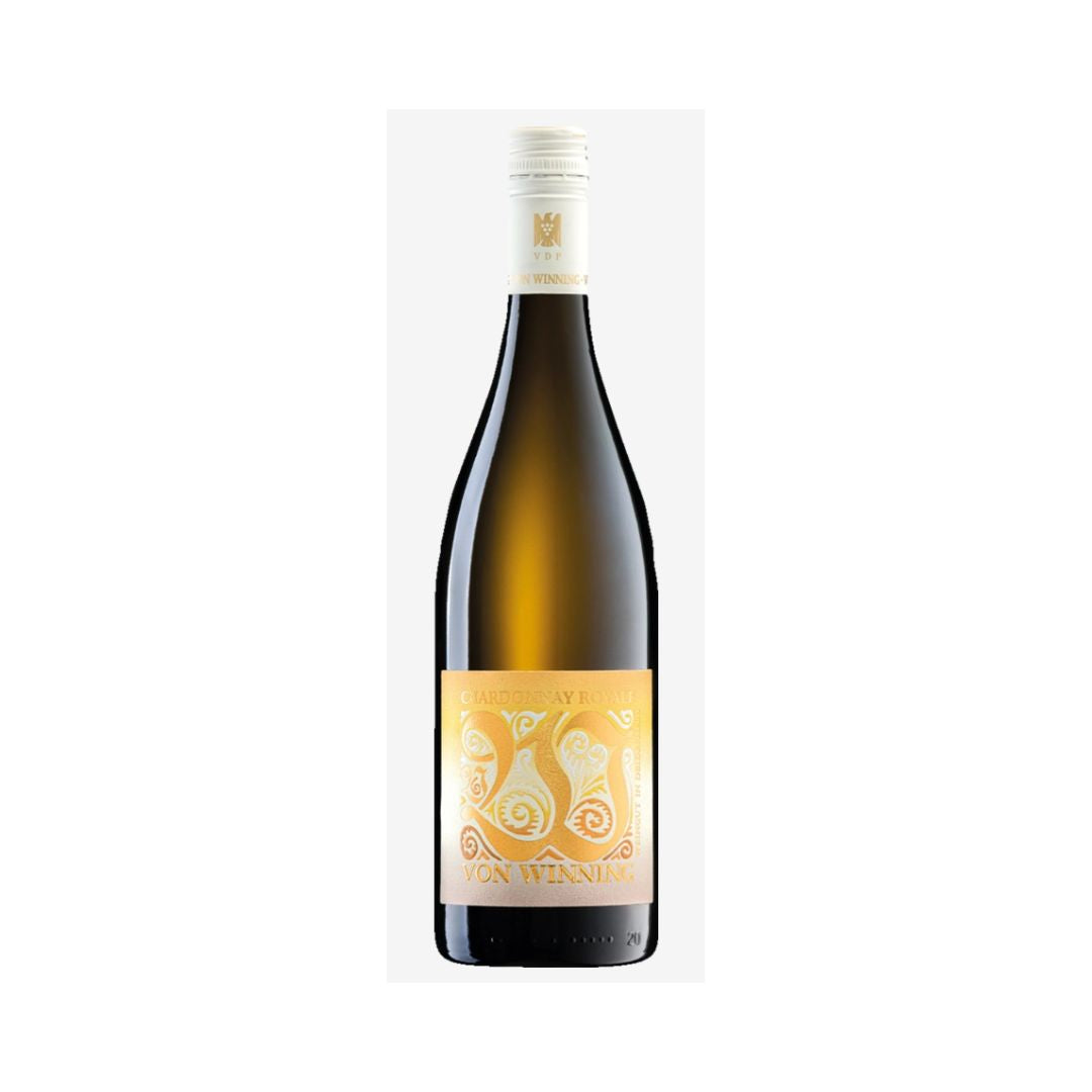 Der Royale ist der Einstieg in die Chardonnays des Weinguts von Winning. Die konzentrierten Aromen zeigen eine leichte Exotik mit Physalis, Banane und Orangenschale sowie eine zarte Butternote. Beim Ausbau auf der Feinhefe in Tonneaus kommt das Holz dezent zur Geltung. Herzhafte Säure und feine Salzigkeit geben dem Chardonnay Royale Frische und Eleganz.